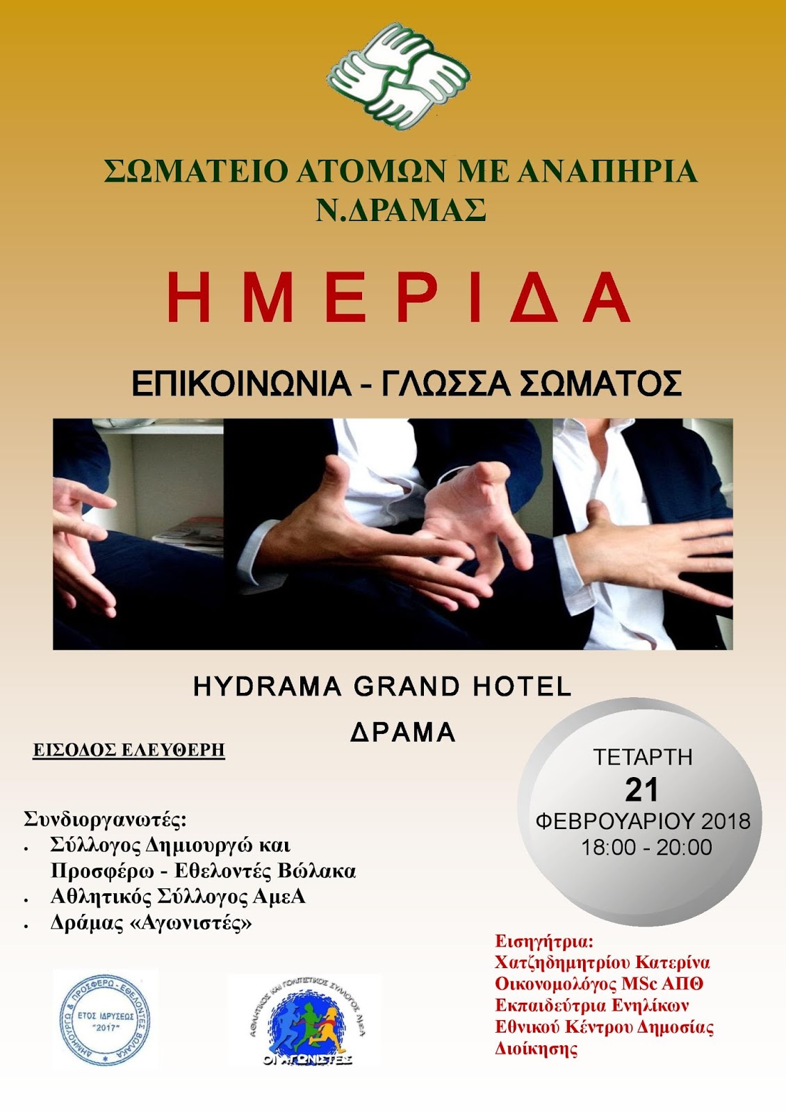 Το Σωματείο ΑμεΑ Ν. Δράμας με συνδιοργανωτές το Σύλλογο Δημιουργώ και Προσφέρω-Εθελοντές Βώλακα και τον Αθλητικό Σύλλογο ΑμεΑ Δράμας Αγωνιστές, διοργανώνουν Ημερίδα με θέμα “Επικοινωνία – Γλώσσα του σώματος” και σας προσκαλούν την Τετάρτη 21 Φεβρουαρίου και ώρα 18:00 μμ στη Δράμα στο ξενοδοχείο Hydrama Grand Hotel.